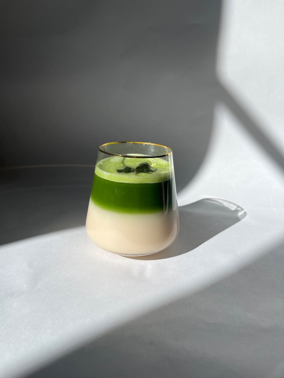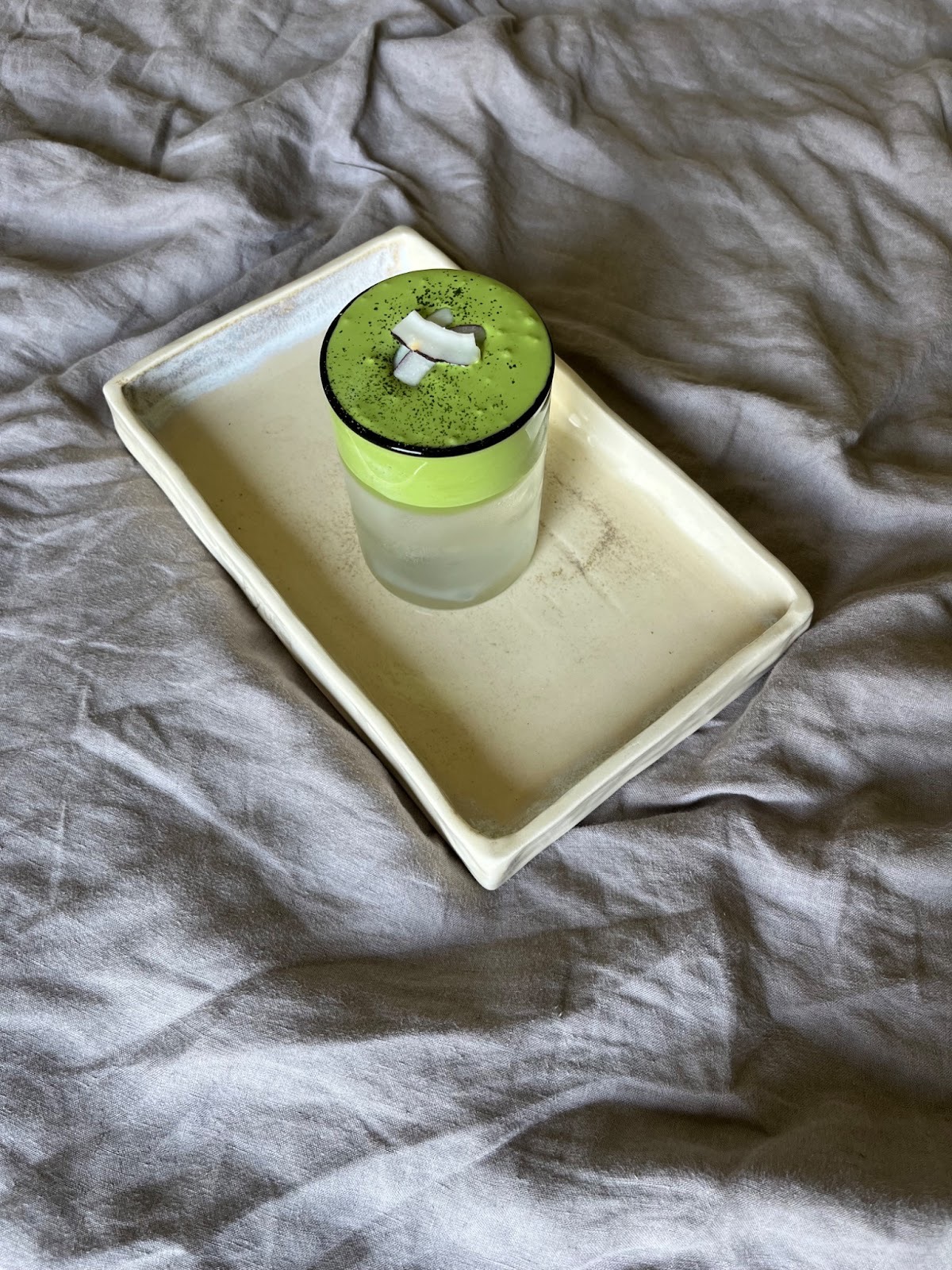 A refresing, tropical take on matcha. Ceremonial- or premium-grade matcha is mixed with under whipped (coconut) cream, creating a fluffy “cloud” texture with subtle natural sweetness. This is then layered on top of coconut water, resulting in a dreamy and beautiful drink.